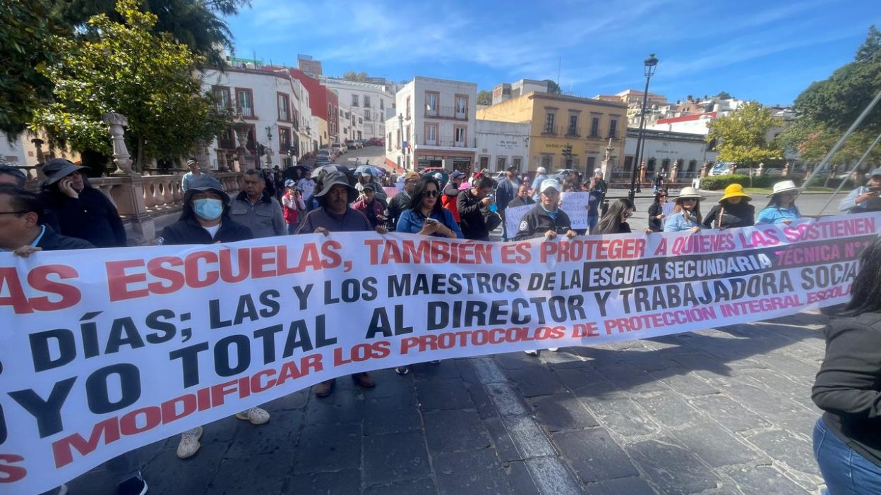 Dursnte la manifestación portaron una lona grande en apoyo al director y a la trabajadora social, y con pancartas pidieron actualizar los porotocolos escolares, y una exigencia a los medios de comunicación de respetoz objetividad, veracidad, e investigar antes de actuar.