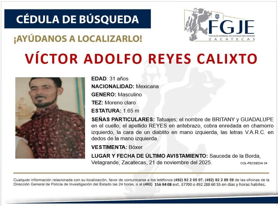 Se trata de dos hombres jóvenes, uno  originario del municipio de Villa de Cos, y el otro de la comunidad de Sauceda de la Borda, Vetagrande, Zacatecas, este identificado como Víctor Adolfo Reyes Calixto, de 31 años de edad.