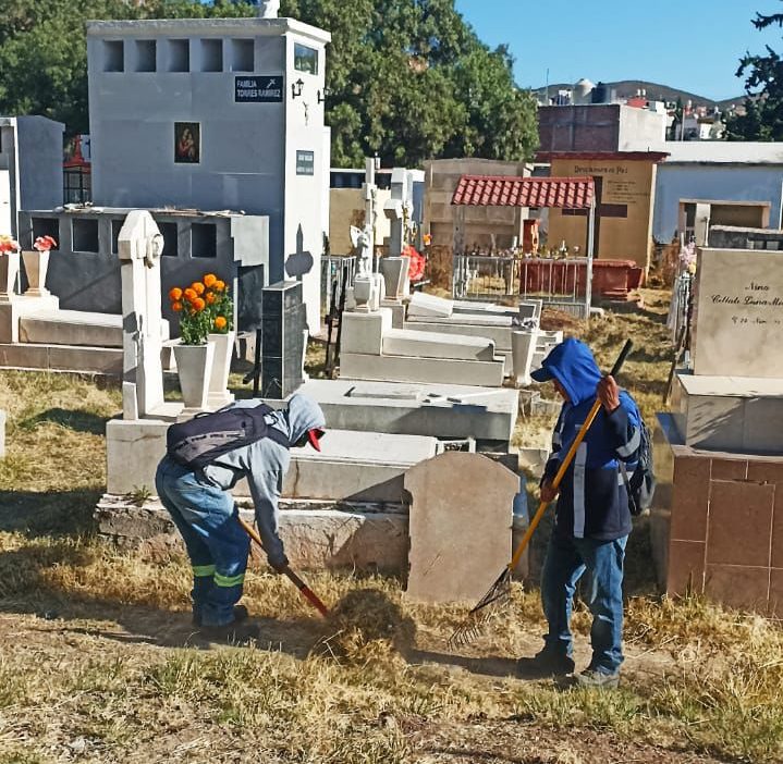 Guadalupe Flores, titular de servicios públicos, indicó que los trabajos son permanentes y se intensifican en esta temporada, y se doblaron las tareas de limpieza y mantenimiento en los panteones, con deshierbe, recolección de basura, conformación de caminos, acarreo de maleza, limpieza de accesos y tapado de gavetas en el Panteón Jardines del Recuerdo, en el de La Purísima, el Panteón de Herrera y en de Cieneguillas.